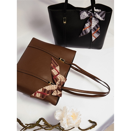 Chic leather‑look tote featuring scarf‑trim handles and a fully lined zip pouch for effortless, organised everyday carrying. Measures: 41 x 28 x 10 cm. Strap length 62cm. PU.