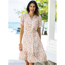Featuring a pretty all over print, this dress flatters with a tiered skirt. A round neckline with a small V and short button placket. 3/4 length sleeves and in a slight A-line shape. 92% Polyester, 8% Elastane.