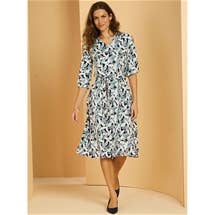 A stylish and flattering lightweight dress. Featuring an all over print, this dress has a V-neckline and elastic cuffs on the long sleeves. Adorned with pleats on the front with a short button placket and ruffle details on the shoulders. 100% Viscose.