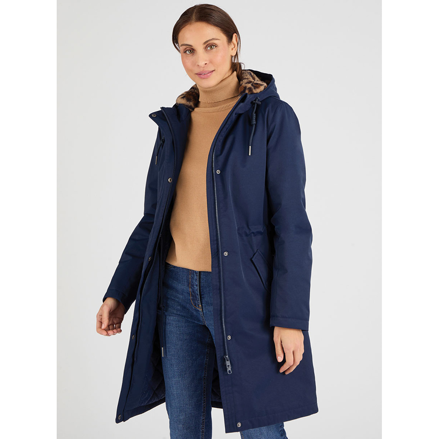 Thermolactyl padded cotton blend coat, plush printed and fur lined. Adjustable waist drawstrings for a flattering fit. Features external side pockets and front zip and snap fastening. 62% Cotton, 38% Polyamide.
