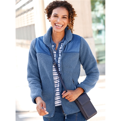 Fleece jacket in a trendy material mix of cozy teddy fleece and woven sections. Protective stand-up collar also with teddy fleece inside. 2 practical zipped pockets. Elastic piping along the zipper and at the cuffs. 100% Polyester.