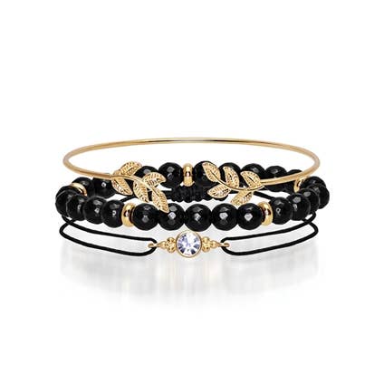 Featuring a sleek goldtone bangle, a bracelet adorned with faceted black onyx‑style beads and a delicate cord bracelet highlighted with a clear crystal centerpiece, this set offers the perfect balance of texture, sparkle and sophistication. Each piece complements the others effortlessly, making it ideal for both everyday wear and special occasions.