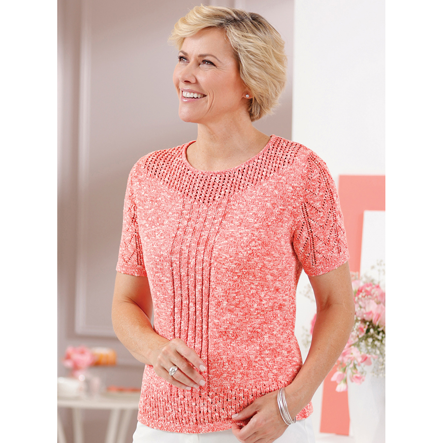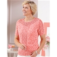 In airy, light, feel-good summer fabric: ajour sweater with a fine pattern on the front, sleeves, and hem. Knitted to shape for a perfect fit. 65% Cotton, 35% Acrylic.