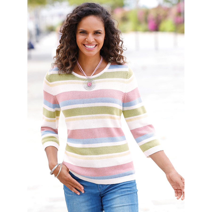 Stunning sweater in a colourful striped pattern. With a round neckline and 3/4-length sleeves. The ends are ribbed. Knitted from soft yarns to fit perfectly. 50% Cotton, 50% Acrylic.