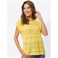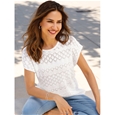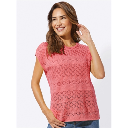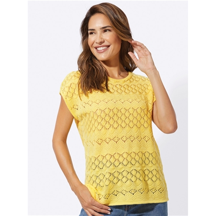 Easy-care ajour sweater in an airy all-over knit pattern. With a round neckline and fashionable dropped shoulders. Ribbed cuffs on the short sleeves and hem. 100% Acrylic.