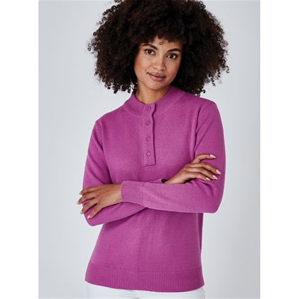 An easy go-to sweater in a brushed textured knit, featuring a stand-up collar and a short button placket front. 100% Acrylic.