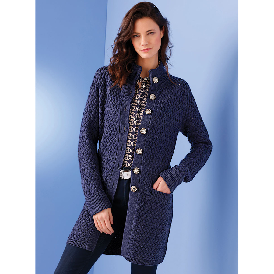 Cardigan with a striking cable-knit pattern. Ribbed button placket with horn-look buttons. Cleverly placed pockets. Particularly dimensionally stable ribbed trims. 75% Acrylic, 15% Wool, 10% Polyamide.