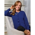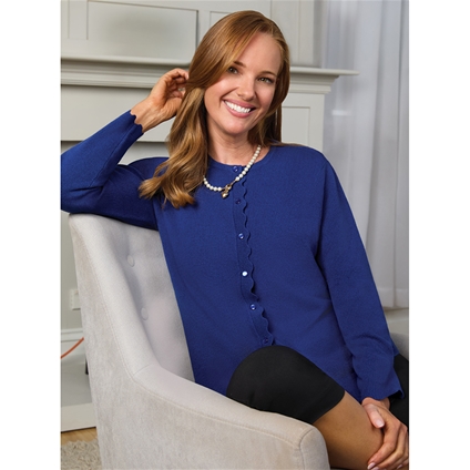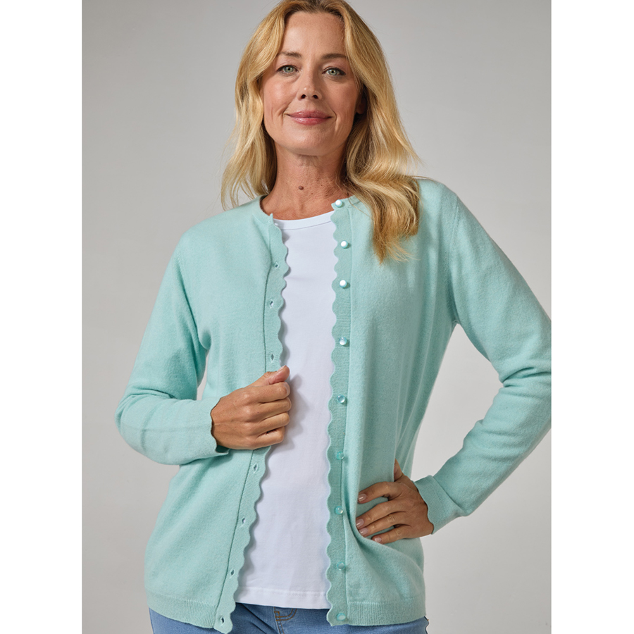 Perfect for everyday wear! Endlessly soft, our long sleeved crew neck cardigan features pretty scallop detailing. 100% Merino Wool.