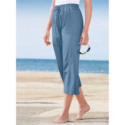 Summer casual crop trousers, great for sunny days and holidays. Blue - 100% Cotton Chambray. Other Colours - 100% Cotton Drill.