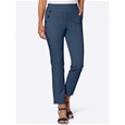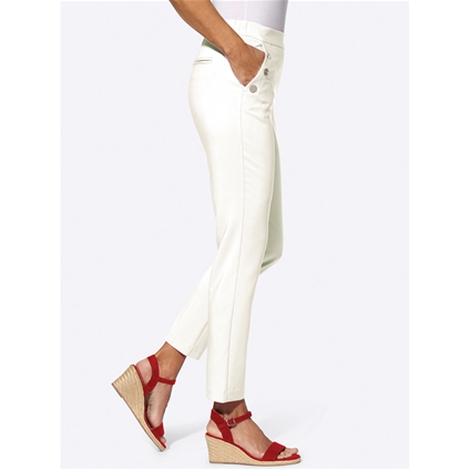 Wonderfully comfortable pull-on trousers that feel good and cut a flattering figure. Smooth waistband at the front, imitation zipper fly and 2 side pockets with decorative buttons. Stretch waistband at the back. 89% Polyester, 11% Elastane.