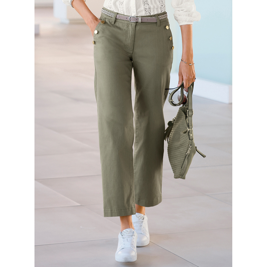 Trendy trousers with wide legs and matte gold-coloured decorative buttons on the side pockets. Waistband with a button and zipper and belt loops (Belt not included). Fitted yoke at the back and 2 pockets. Length: 94cm-98cm. 96% Cotton, 4% Elastane.