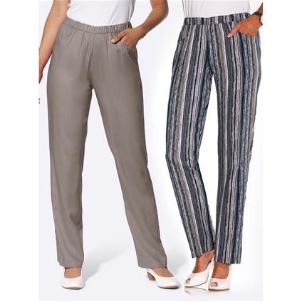 Plain and patterned: affordable double pack of pants in a comfortable slip-on style and comfortable fabric. Side pockets. Skin-friendly and breathable. Length: 103cm-107cm. 100% Viscose.