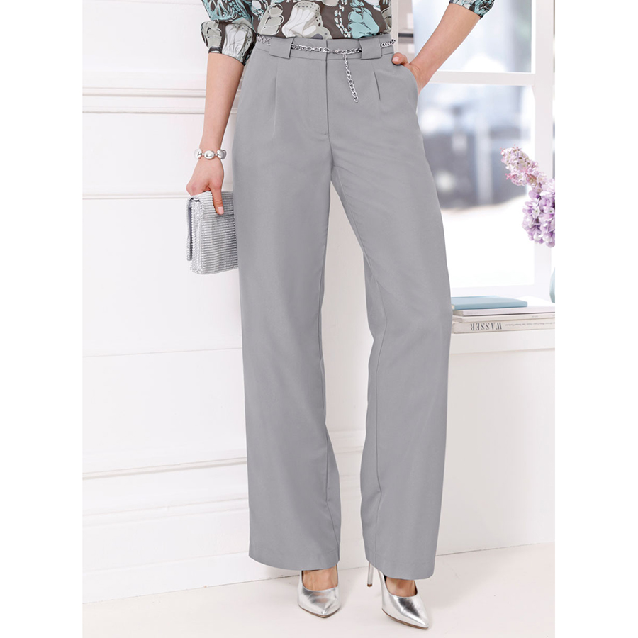 Stylish and very flattering - wide-leg trousers with pleats. With a button, hook and eye, zipper, belt loops and 2 front pockets. The fashionable chain belt is included with the purchase of the trousers. Length: 106cm-110cm. 100% Polyester – Exclusive of Trims.