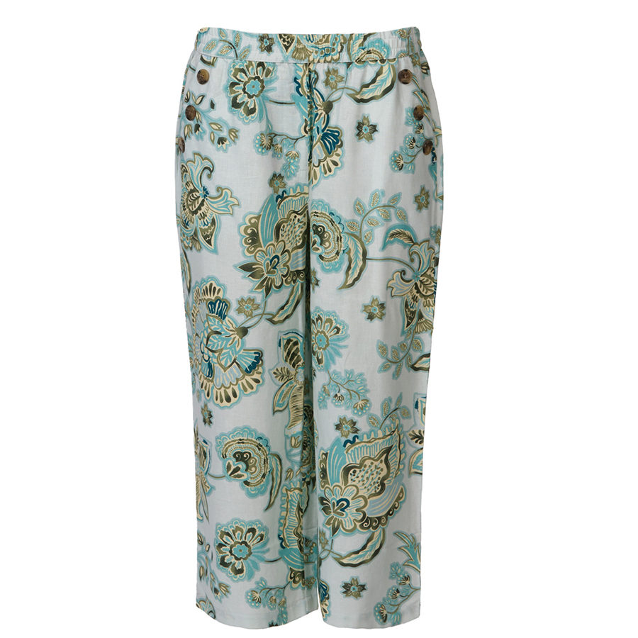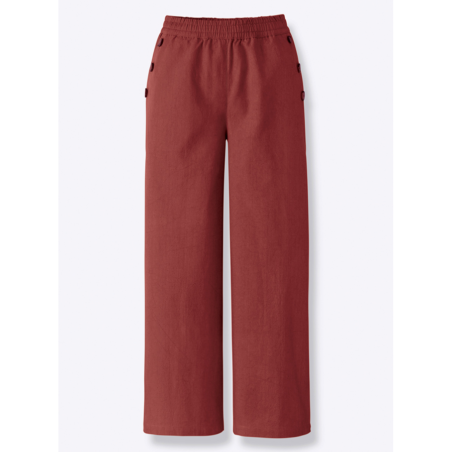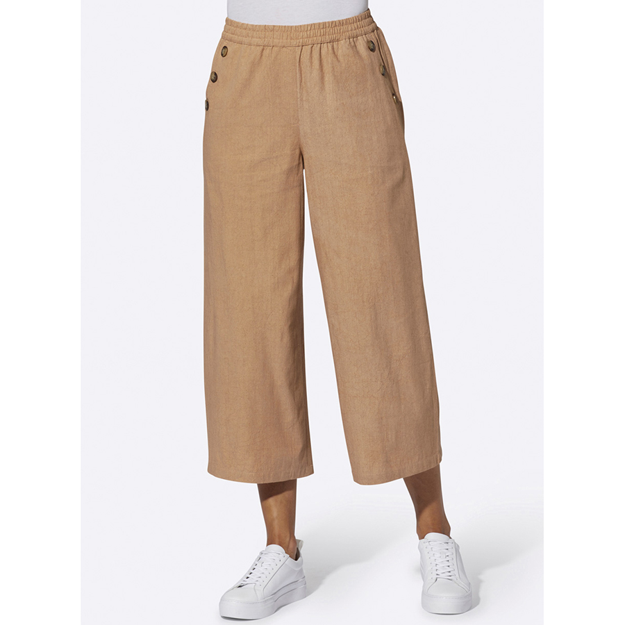 Stay trendy with these airy culottes! With the cotton-linen mix these pants are so light and breathable to wear. The all-round stretch waistband ensures extra comfort, with two front pockets featuring decorative buttons, and two mock pockets on the back. 70% Cotton, 30% Linen.