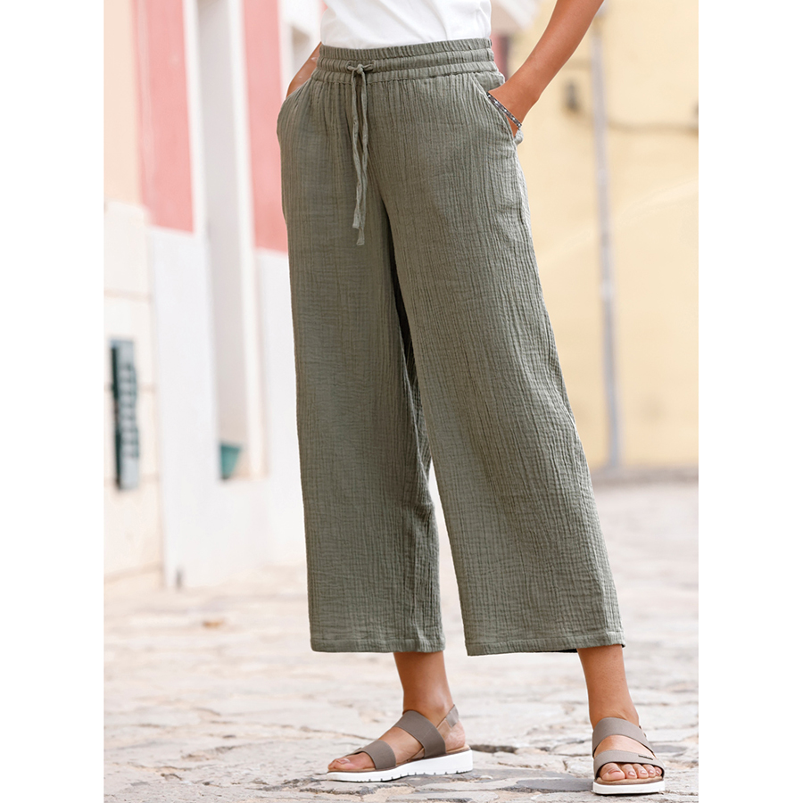 Light, airy and beautifully structured - culottes in a cotton gauze fabric with a high waist, wide all-round elasticated waistband with drawstring and two practical pockets at the front. Length: 92cm-96cm. 100% Cotton.