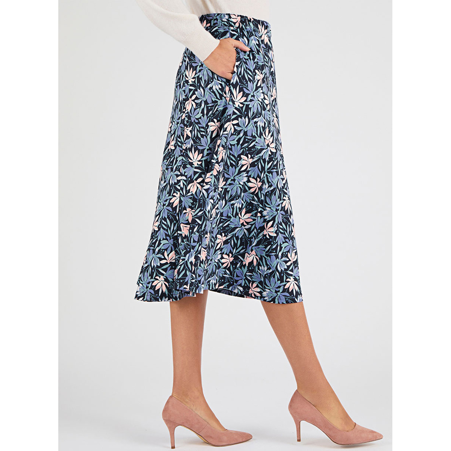 Lightly brushed fabrication with a fluid, feminine drape. Designed with a comfortable pull-on elastic waistband and a below-the-knee length silhouette. 92% Polyester, 8% Elastane.