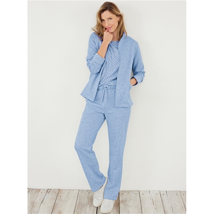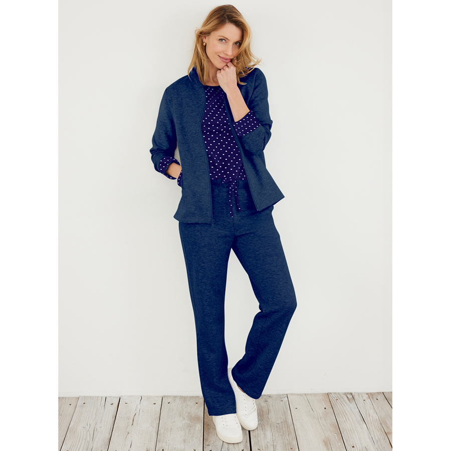 You will love this amazing 3 piece tracksuit! Featuring a jacket with zip front and front pockets with contrast polka dot trim inside the collar. Full length pants with tie front and elastic waist for a comfortable fit and 2 side pockets. Crew neck printed tee featuring a lovely polka dot design. 65% Polyester, 35% Cotton.