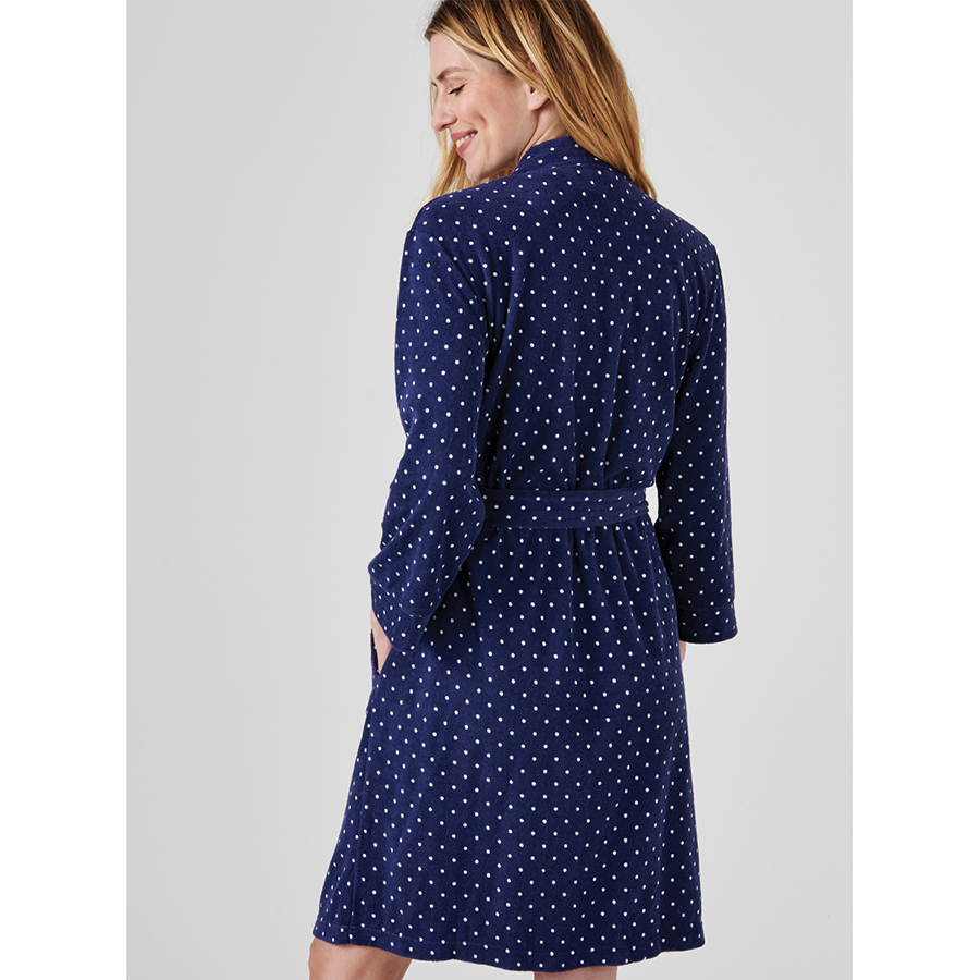 Relax in style! Crafted from a soft cotton blend for comfort, this robe features a playful polka dot print and a flattering waist tie. It’s perfect for cosy mornings or winding down at night. 84% Cotton, 16% Polyester.