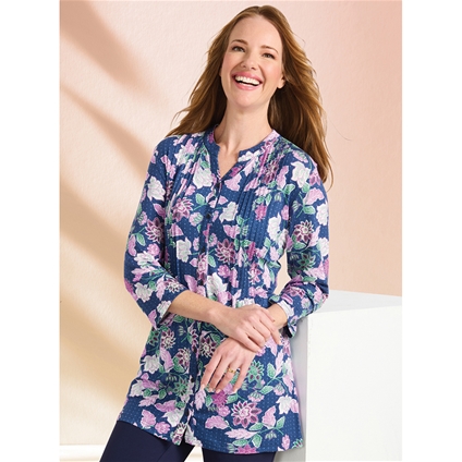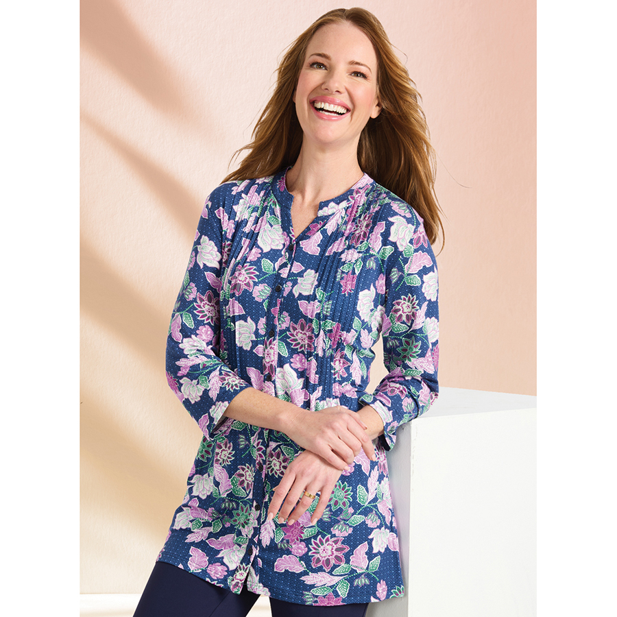 Very light ¾ sleeve tunic top with Nehru collar, V-neck and stylish pintuck detail. Perfect for those hot summer days with a hint of stretch for extra comfort. 95% Viscose 5% Elastane.
