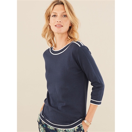 In a soft and light cotton knit, this striking top is so pleasant to wear during the warmer months. Embellished with contrast piping on the boat neckline and hem, this top has ¾ length sleeves and ribbed finishes. 100% Cotton.