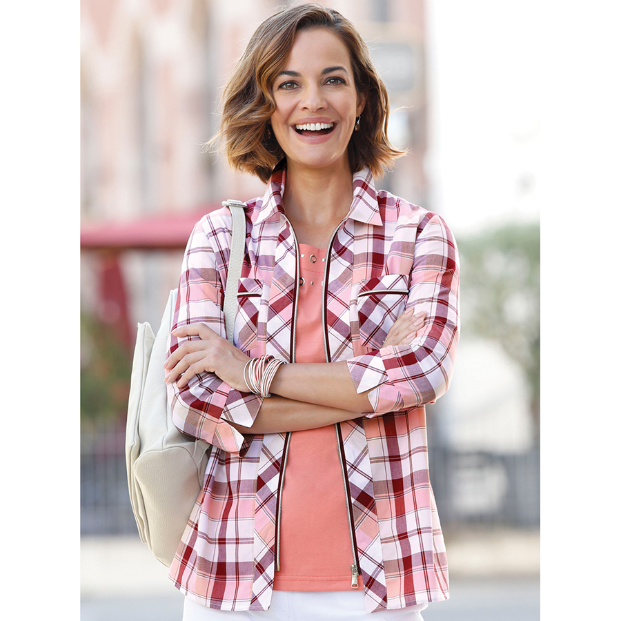 The perfect casual layering piece! This modern checked blouse features a full zipper, decorative patch pockets and side slits. ¾ length sleeves with cuffs for a stylish look. 65% Polyester, 35% Cotton.