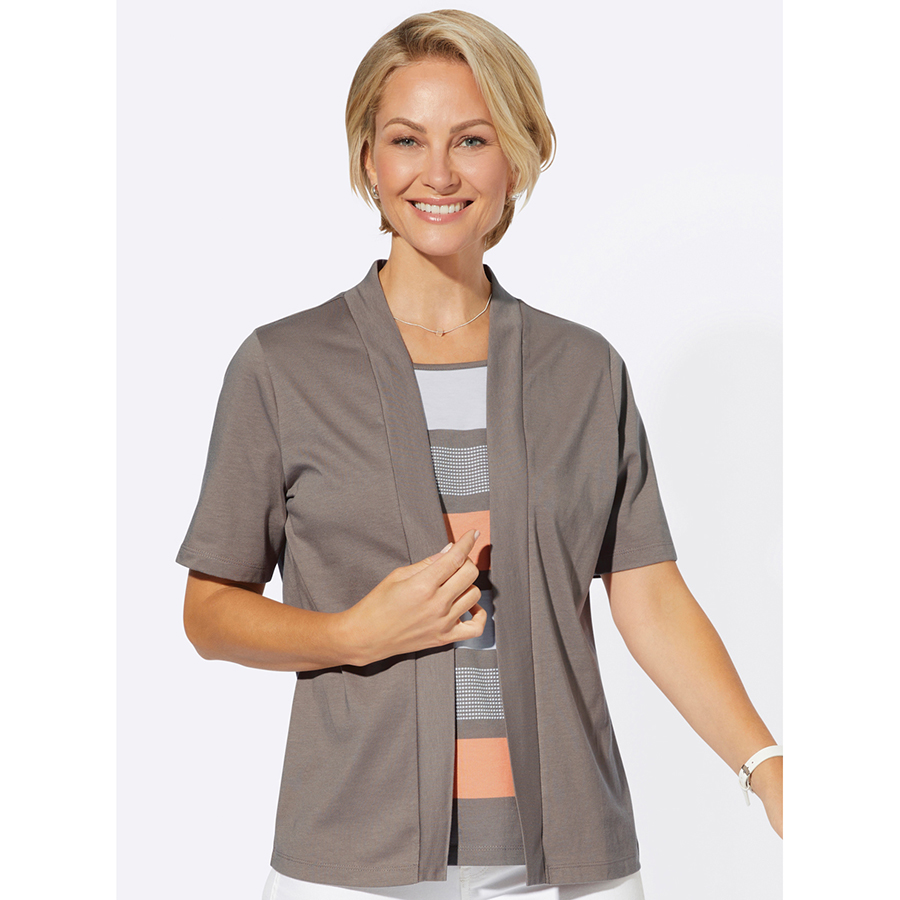 Embody elegance with this 2-in-1 attractive Stripey Twofer. A plain cardigan with short sleeves for ease of wear and a striped insert with a round neckline. Choose from a lovely summery colour palette. 50% Cotton, 50% Modal.