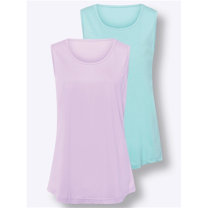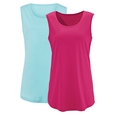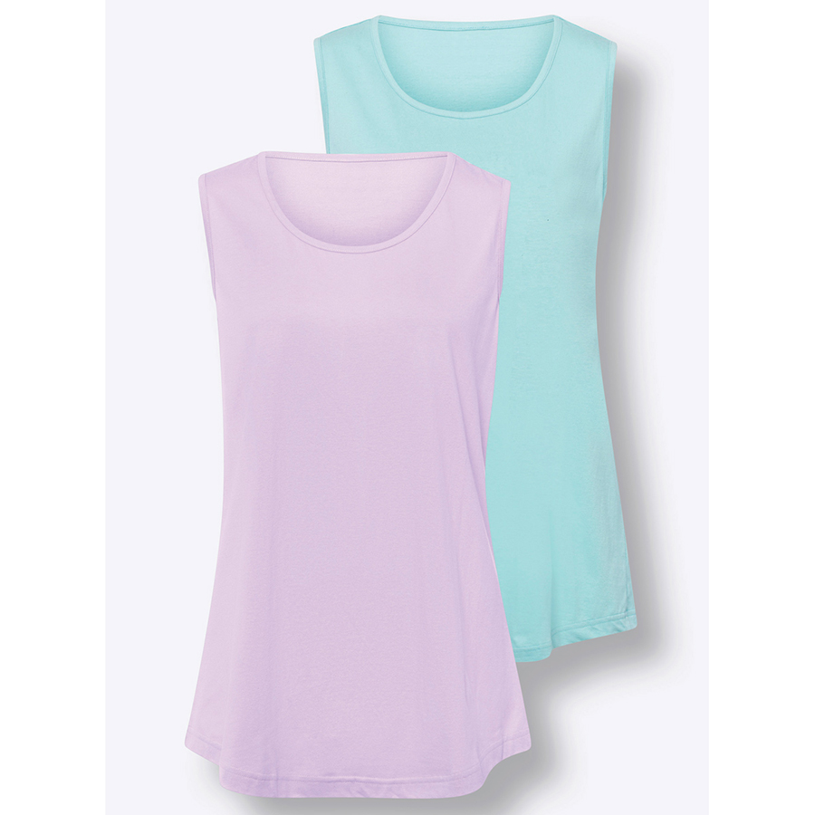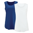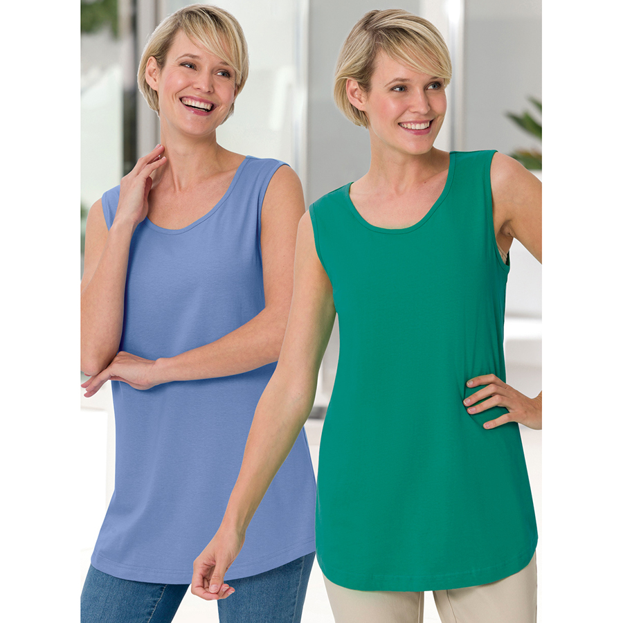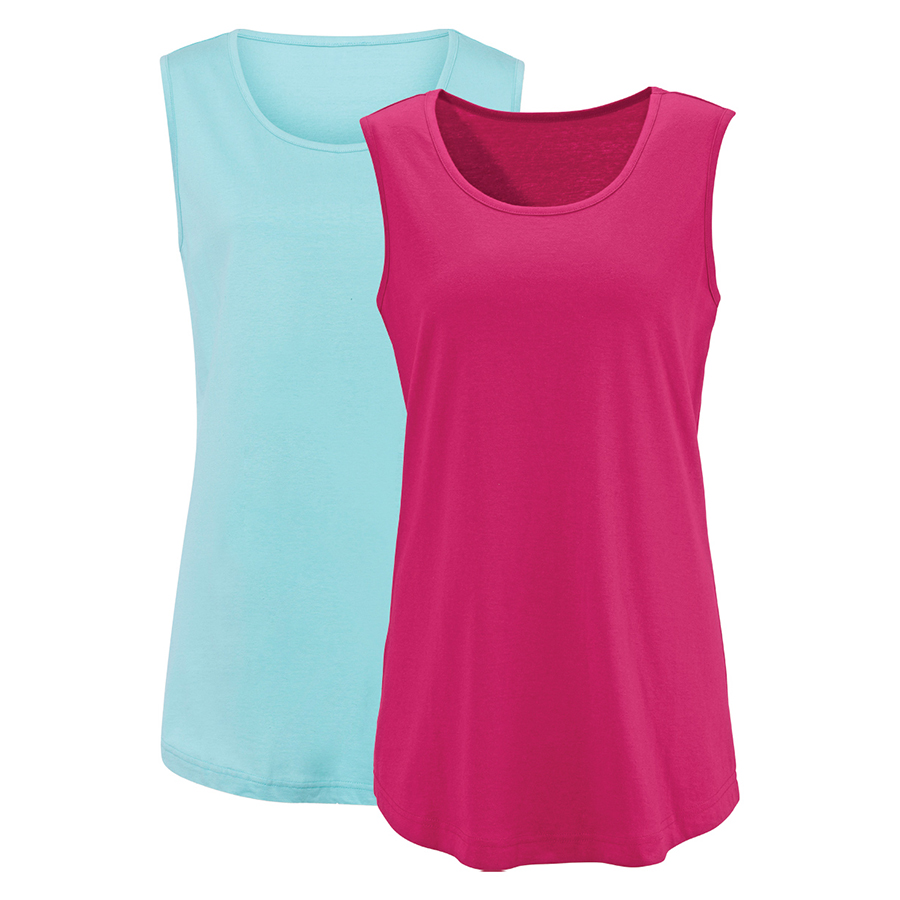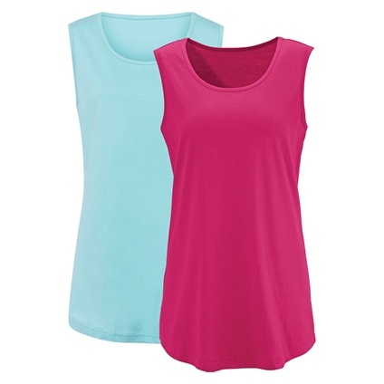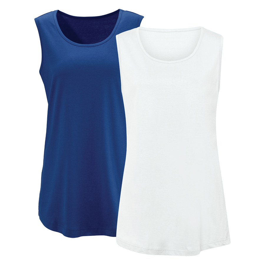 In a pack of two, these camis are in a flattering long A-line shape. With a round neckline, thick shoulder straps and a rounded hem. 100% Cotton.