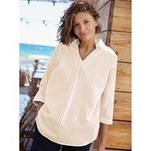 Delicate and elegant in a stunning longline silhouette is this tunic. Featuring lace detail on the ends of the ¾ length sleeves and hem. A round neckline with a small V, short button placket and pintucks for fit. 100% Cotton.