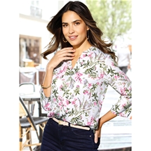 An elegant top that is so flattering. Elastic cuffs on the 3/4 sleeves and a round neckline with gathering. Adorned with a lovely floral print, this top can be paired with jeans or trousers for a casual, yet elegant look. 92% Polyester, 8% Elastane.