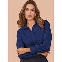 A smart geometric print on an elegant blouse. A round neckline with a half front button placket for ease of wear. Long sleeves with cuffs and ruffles at the shoulders. 92% Polyester, 8% Elastane.