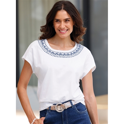 Round neck shirt with pretty, elaborate contrast embroidery on the neckline. Dropped shoulder for a relaxed fit and straight hem. 100% Cotton.