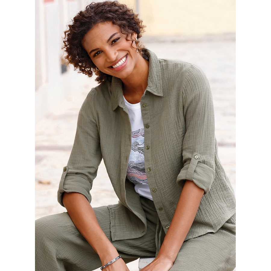 Crafted from wonderfully soft cotton gauze, this structured blouse features a classic shirt collar, a full-length button placket, and long sleeves with button cuffs that can be fastened at three-quarter length using the button tabs. A slightly rounded hem and a box pleat at the back add a flattering, feminine touch. 100% Cotton.