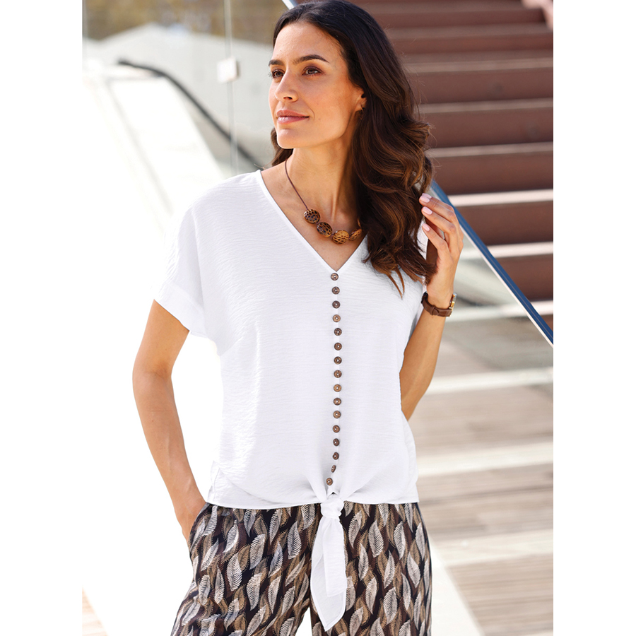 Uncomplicated slip-on blouse in a high-quality, slightly shiny textured fabric. With a V-neckline, dropped shoulders with a turnback at the hem. Central dividing seam at the front with decorative buttons in a coconut look, which ends with a small slit that can be tied in a trendy knot. 90% Viscose, 10% Polyamide.
