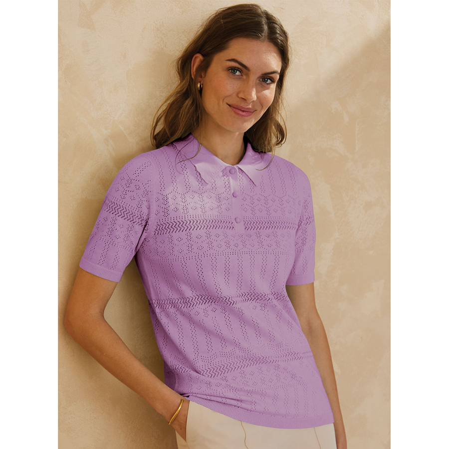 A casual and sporty polo in a pretty pointelle knit. This top has a short button placket and polo collar. Short sleeves and made in a cotton mix for comfortable all day wear. Featuring a lovely pointelle knit for design. 83% Cotton, 17% Nylon.