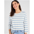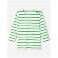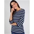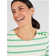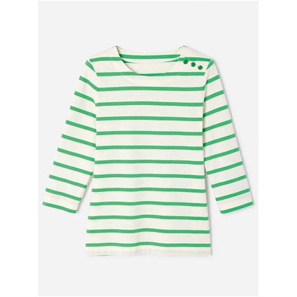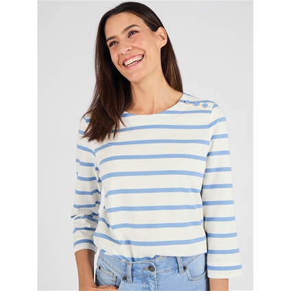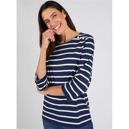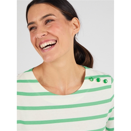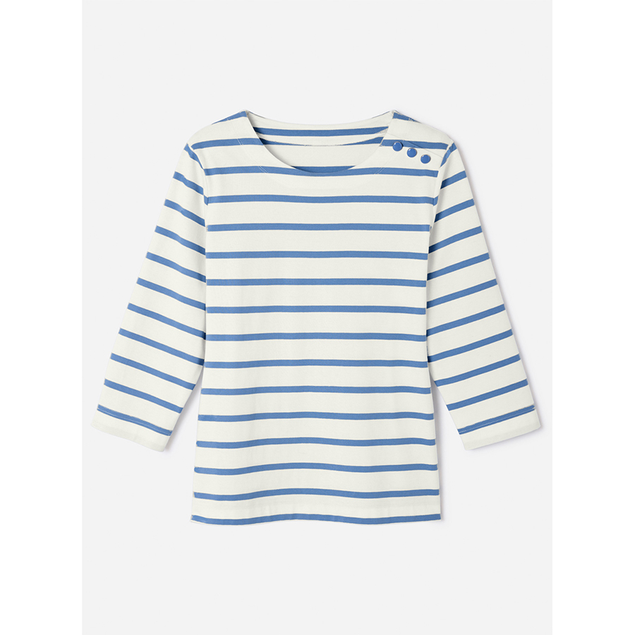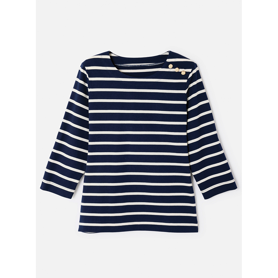 Pure cotton striped jersey t-shirt with boat neck, 3/4 sleeves and a faux shoulder placket with gold-tone buttons. Perfectly aligned stripes for a polished finish. 100% Cotton.