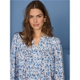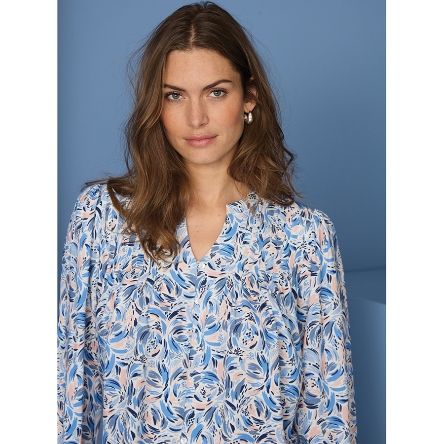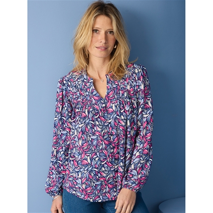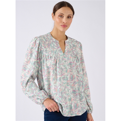 Split collar printed blouse with elastic sleeve cuffs in pretty feminine prints. 100% Viscose.