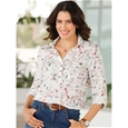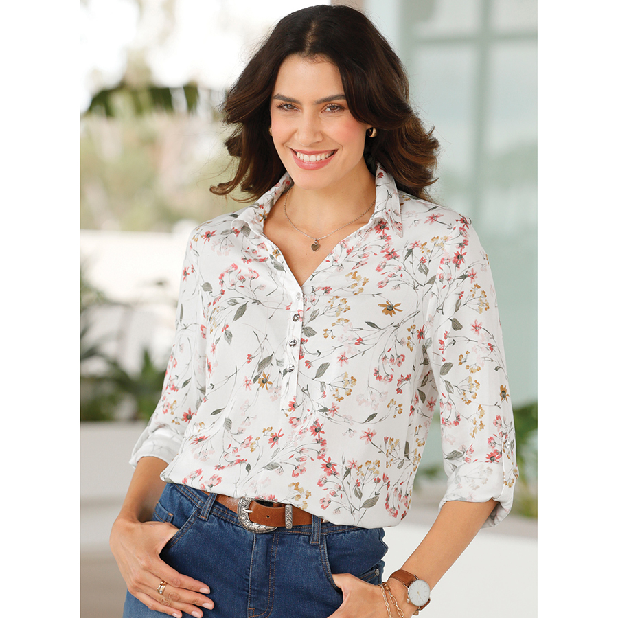 In an attractive floral pattern with a shirt collar and short button placket. Chest darts for a perfect fit. The long sleeves can be rolled up and then fastened with a tab. Rounded hem with side slits. 100% Viscose.