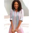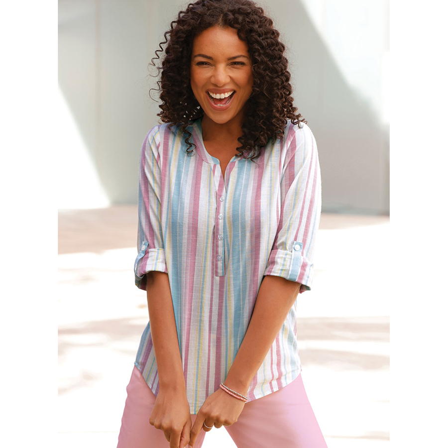 The cheerful colours really put you in a good mood! Casual slip-on blouse made of lightly textured fabric. Round neckline with a small V. The box pleat at the back gives a flattering width. Short button placket and shaping bust darts. The long sleeves can be rolled up to 3/4 length and then fastened with a tab and button. Slightly rounded hem. 100% Cotton.
