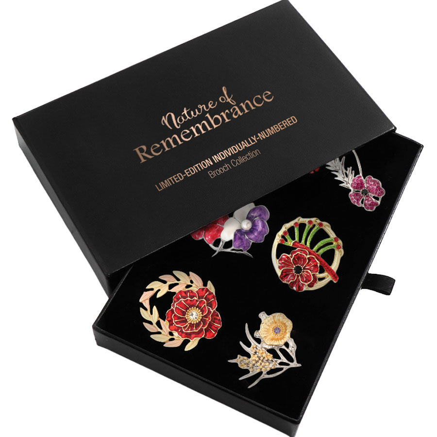 Collect them all! Beautifully presented, the Nature of Remembrance Limited-Edition Brooch Collection brings together six thoughtfully curated symbolic designs in one exclusive set. Strictly limited to just 250 individually numbered sets worldwide, each brooch shares the same unique number for true collectability. Featuring the enduring poppy alongside purple poppies honouring animals of war, plus laurel and rosemary motifs, every piece reflects sacrifice, resilience and memory.