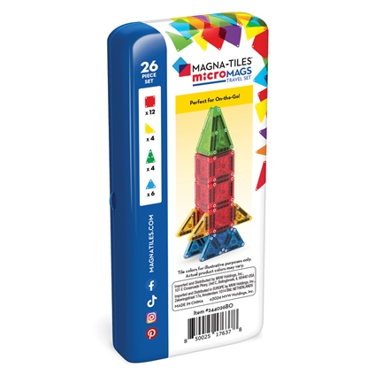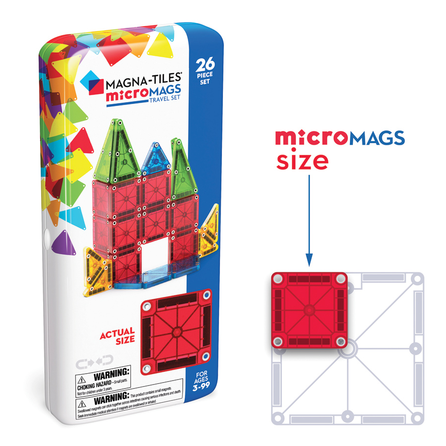Take creativity on the go with the MAGNA-TILES microMAGS Travel Set! Includes 26 pieces. Compact, portable and compatible with all MAGNA-TILES – perfect for travel, playtime and imaginative building anywhere, anytime! Dimensions: 8.5W x 18.5H x 2.5D cm. Ages 3+