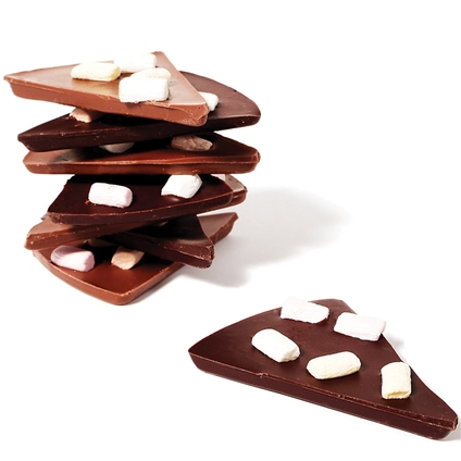 Couverture dark chocolate (45.5%) (cocoa mass, sugar, cocoa butter, emulsifier: soy lecithin, natural vanilla flavour), Couverture milk chocolate (45.5%) (sugar, cocoa butter, whole milk powder, cocoa mass, emulsifier: soy lecithin, natural vanilla flavour), confectionary balls 7.5% (sugar, starch (wheat, corn), water, glucose syrup (wheat, corn) colours E120, E160a, glazing agent: E901, vegetable oil (coconut, rapeseed) hearts in confectionary 1.5% (powdered sugar,egg whites, lemon juice, powdered food colouring: concentrate (radish, blackcurrent, apple)