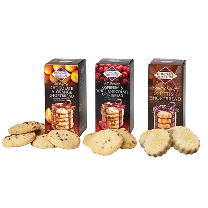 Scottish shortbread made with the Duncan’s family recipe, using pure Scottish butter and hand baked to perfection Comes in three delectable flavours of chocolate & orange, raspberry & white chocolate and traditional family recipe.