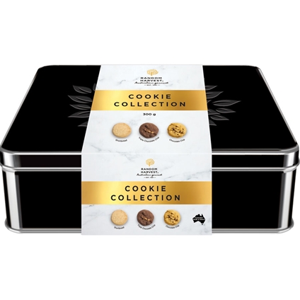 Perfect for sharing, gifting or enjoying with a cup of tea, this classic selection brings together a trio of irresistible cookie favourites. Presented in a stylish, reusable black Random Harvest tin, it’s a timeless treat for any cookie lover.
