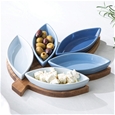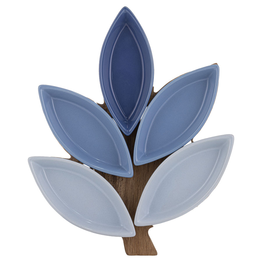 Mossman 6pc Bowl and Board Set: Bring style to your table with this striking leaf-shaped acacia wood board (30 x 25 x 4.3 cm) and five coordinating bowls in varying shades of blue.
