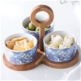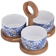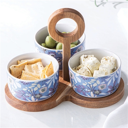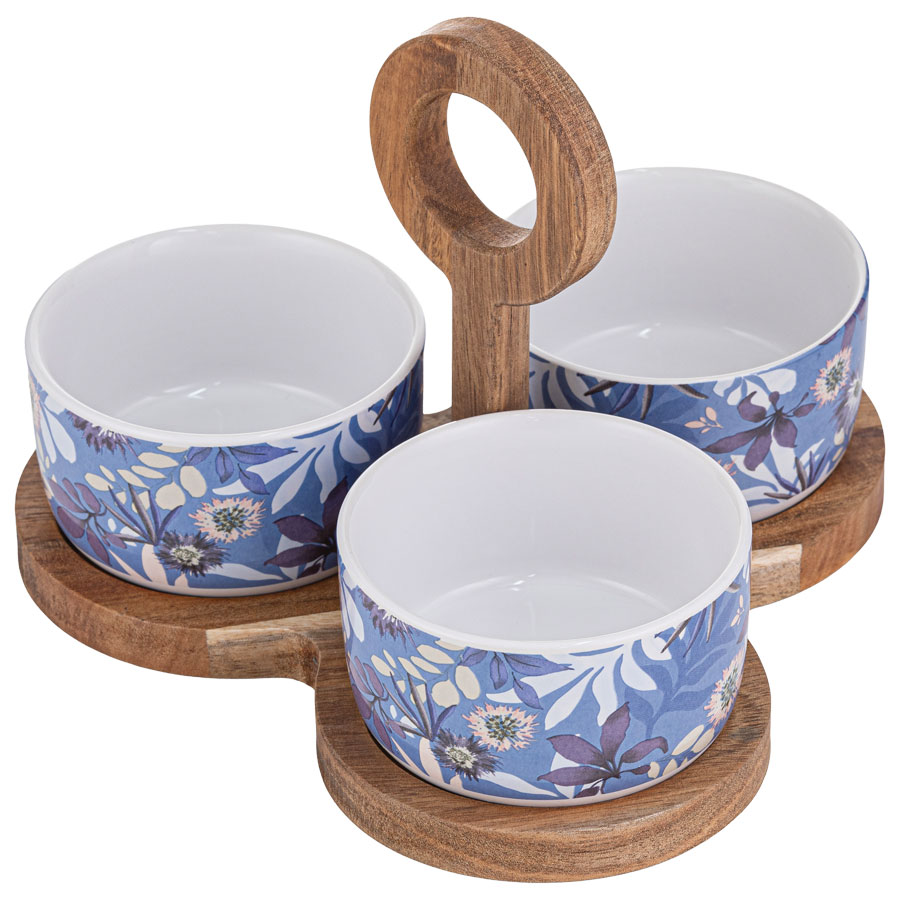 Mossman 4pc Bowl and Tray Set: Featuring a solid acacia wood tray (22 x 21 x 15.5 cm) and three bowls on a matching acacia stand with carry handle, it’s perfect for serving dips, nibbles or small bites with effortless style.