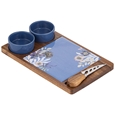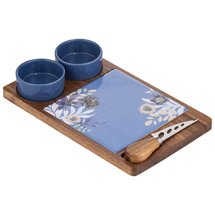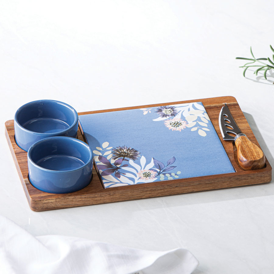 Mossman 4pc Serving Set: This charming 4‑piece serving set pairs a board with ceramic inlay, two matching bowls and a cheese knife in a hand‑painted floral design. Beautifully boxed for gifting. Size: 26 × 16.5 × 4.5 cm.
