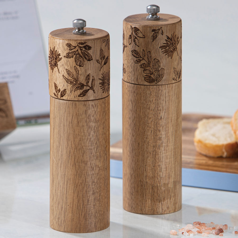 Mossman Salt and Pepper Grinder: Crafted from acacia wood and featuring a delicate floral-etched design, these grinders combine natural beauty with functionality. Set of 2.