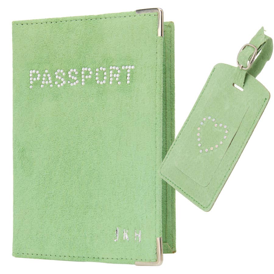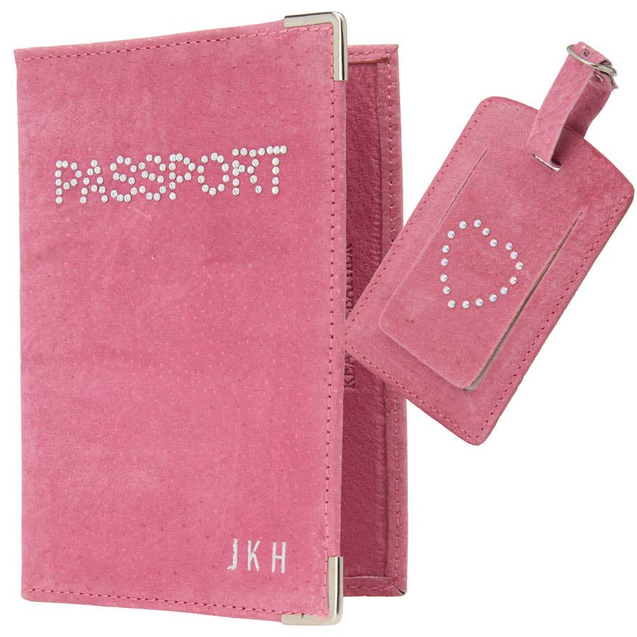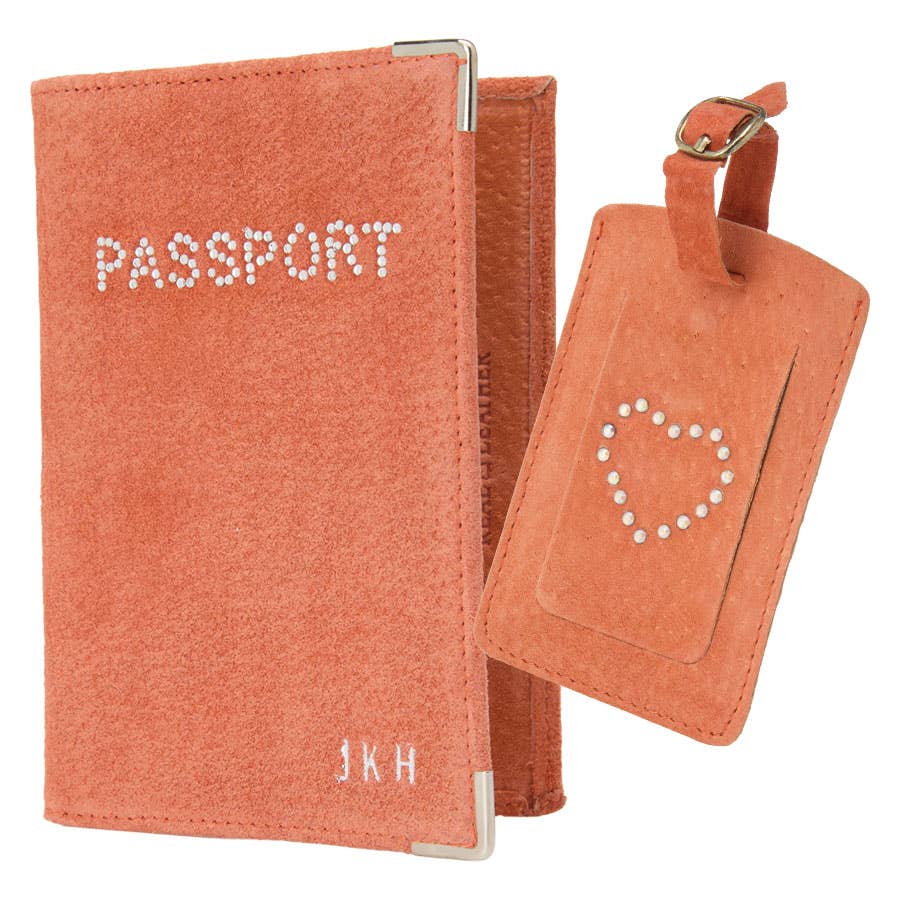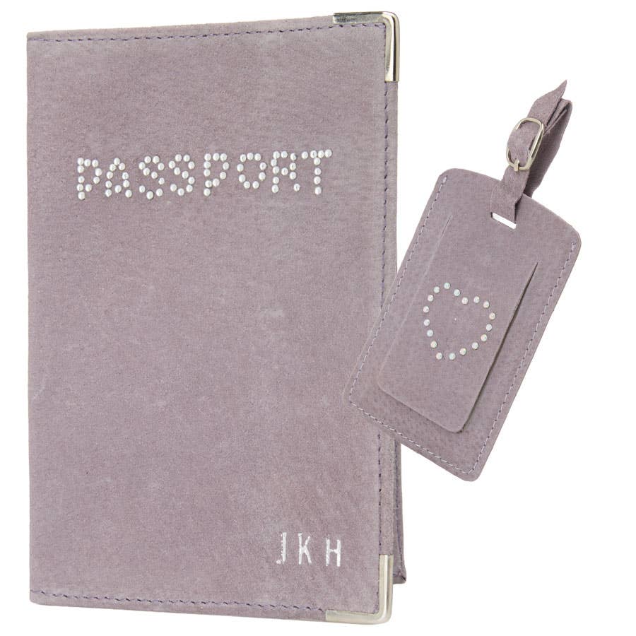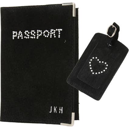 Travel in style with this personalised suede passport holder and matching luggage tag. The passport holder can be customised with up to three initials, while the tag features a sparkling diamonte heart detail for a stylish finishing touch. Passport holder measures 14 × 9.7 cm and the tag 19 × 6.5 cm. Up to 3 initials.