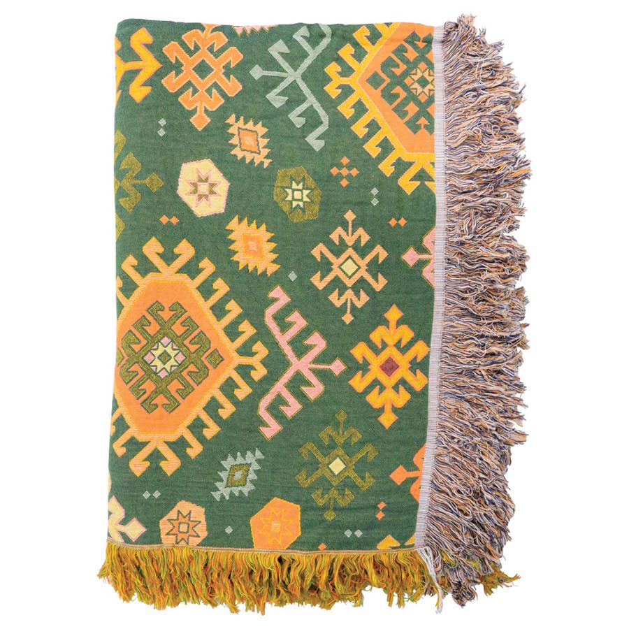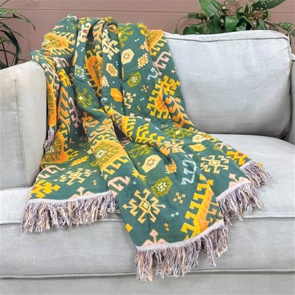 This generously sized cotton throw brings warmth, texture and a confident decorative statement all at once. With its green and gold geometric design, fringed edges and multicoloured tassels, it adds a rich boho feel to sofas, beds and reading corners. Because it is made from 100% breathable cotton, it is just as comfortable to use as it is striking to display. Whether you are layering it for warmth or using it to transform a room, it is designed to do both beautifully. A standout piece for cosy spaces that need a little more character. Size: 230 x 200 cm.