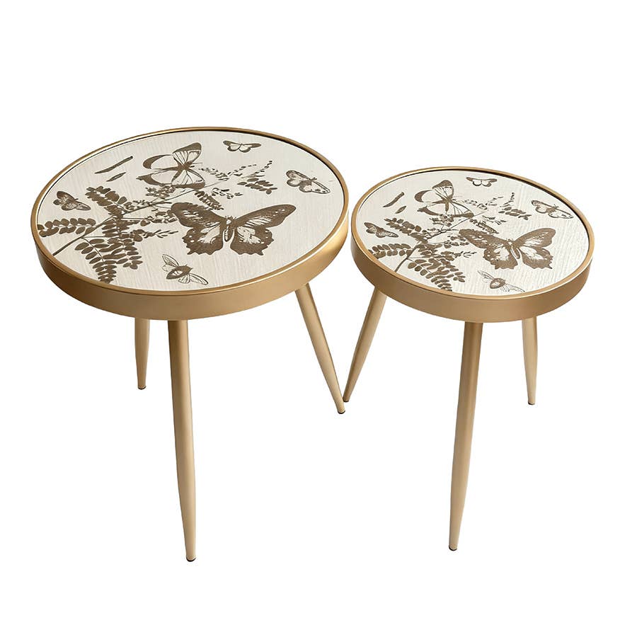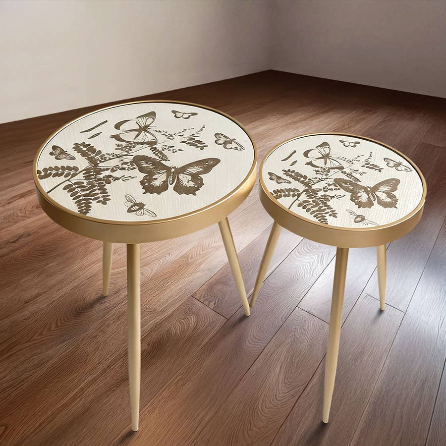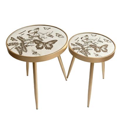 These nesting tables bring together decorative charm and everyday practicality in one clever set. The butterfly detailing and soft champagne finish give them a light, graceful feel, while the smaller table slides neatly beneath the larger one when not in use. Use them as side tables, accent tables or flexible extra surfaces when entertaining. With glass tops and a sturdy metal frame, they balance style and function beautifully. A lovely choice when you want furniture that works hard and still feels special.